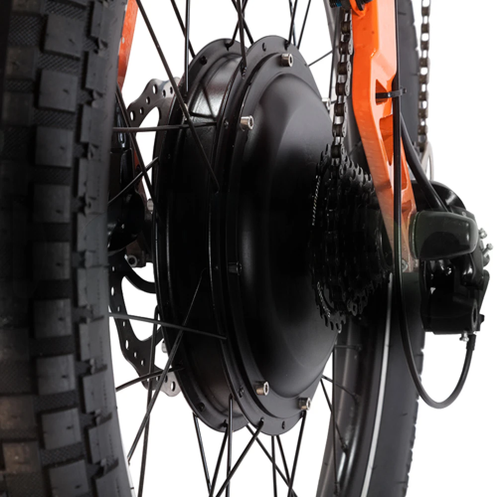 При мощность велогибрида 1000 Вт максимально выжимаемая скорость составляет 40 км/час, а пробег на одной подзарядке может доходить до 50 км. 24-дюймовые колеса с широкими покрышками в сочетании с передними и задними амортизаторами обеспечивают плавность езды по неровностям.
