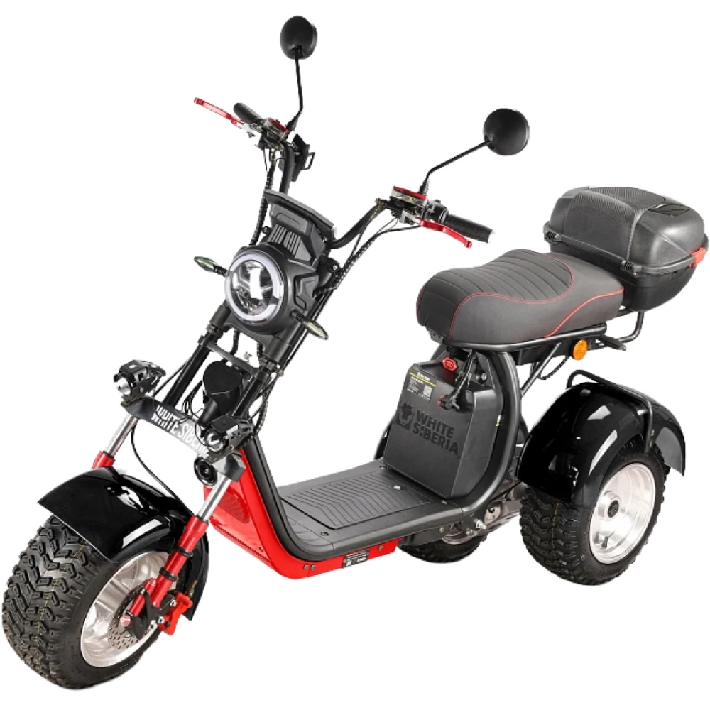 Трехколесный вариант электроскутера оснащен большими устойчивыми колесами, широким мягким сиденьем и вместительной кофрой. Техника оснащена всем необходимым для активного время провождения, поездки на рыбалку или другой вид отдыха.