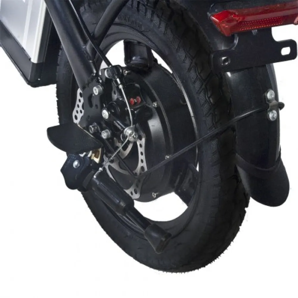Мощность электромотора 350 Вт и емкости батареи – 12 А*ч достаточно для развития приличной скорости – до 45 км/час и преодоления расстояния до 42 км пути. Байк оснащен механическими тормозами и 14-дюймовыми накатистыми колесами. Батарея размещена за подседельной частью в специальном блоке. Надежно спрятана от негативных воздействия погодных факторов.