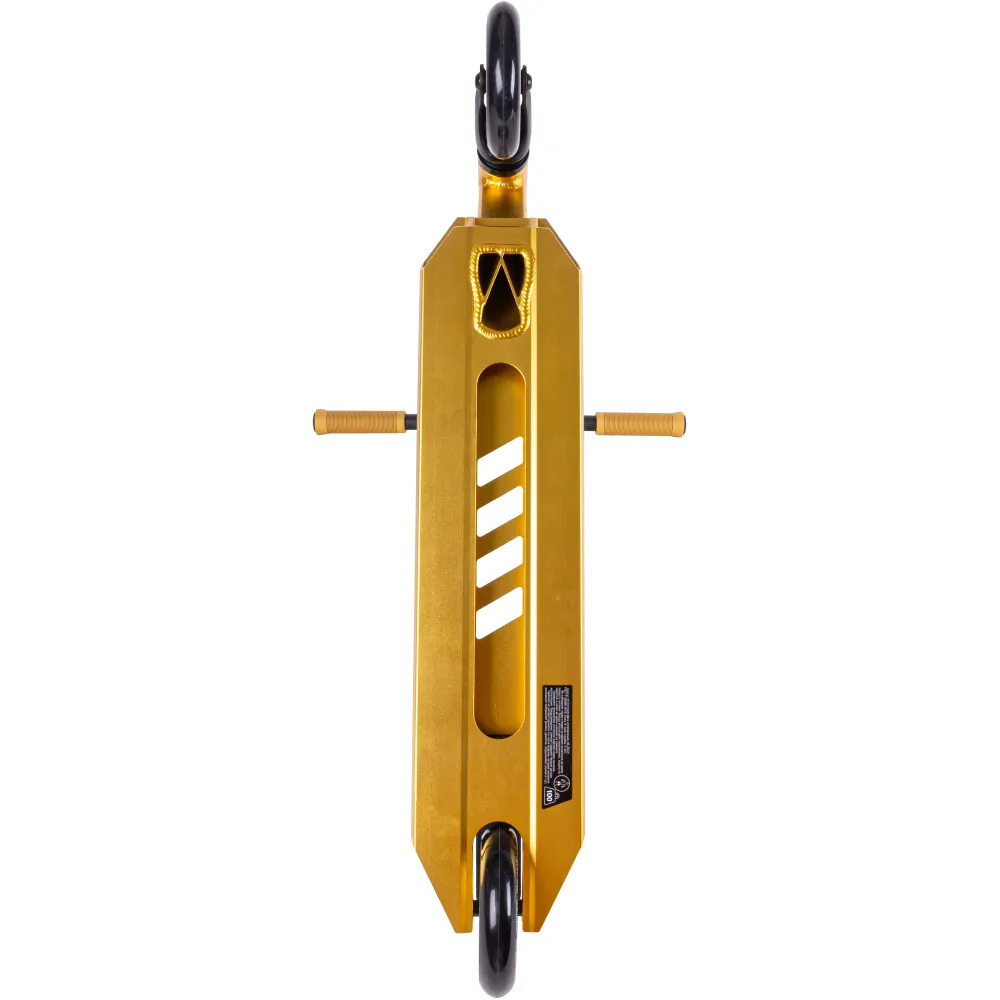Самокат предназначен для ездоков начального уровня. Рулевая часть изготовлена из хроммолибденовой стали. Ширина руля удобная для захвата - составляет 51 см, по высоте – 57 см. Рулевая часть надежно зафиксирована 2 болтами. Исключение непредвиденных действий при выполнении трюков обусловлено удлиненными дышащими прорезиненными грипсами и нескользящей шершавой декой. Наличие выреза облегчает вес основного изделия. Полиуретановые 110-мм колеса с подшипниками ABEC 9 и фирменная тормозная система из нейлона+сталь обещают отличный накат и своевременность торможения. В комплектацию с техникой входят фирменные наклейки и гаечные ключи. Если вас заинтересовал самокат, вы нацелены на совершенствование спортивных достижений, предлагаем приступить к оформлению заказа прямо сейчас.