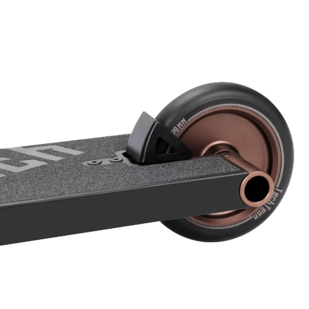 .Деку изготавливают из алюминия в форме коробки, ширина которой - 13,5 см, длина 55 см и футспейс 42 см. Благодаря таким размерам появляется более пространства для ног, если сравнивать с другими типами самокатов. Впереди скошенный фрагмент заваивают, а сзади устанавливают дропауты формы цилиндра для любителей гриндов. В данной модели используется Fender, как и в самокате ZORG. Благодаря данному жёсткому элементу, выполняется защита колеса сзади от непроизвольного торможения при исполнении трюков.